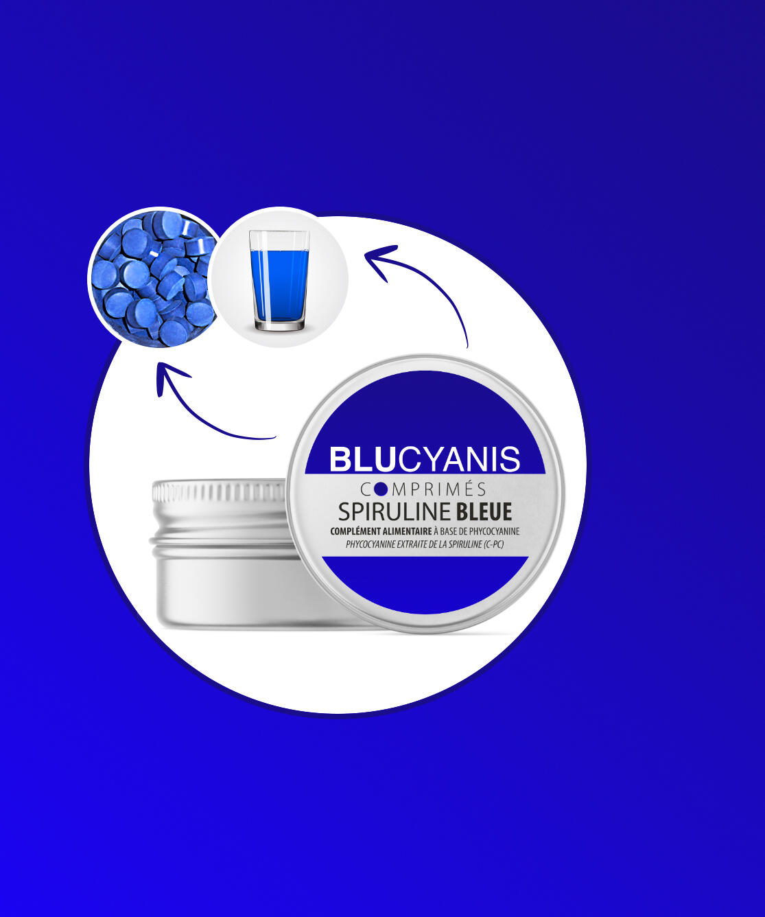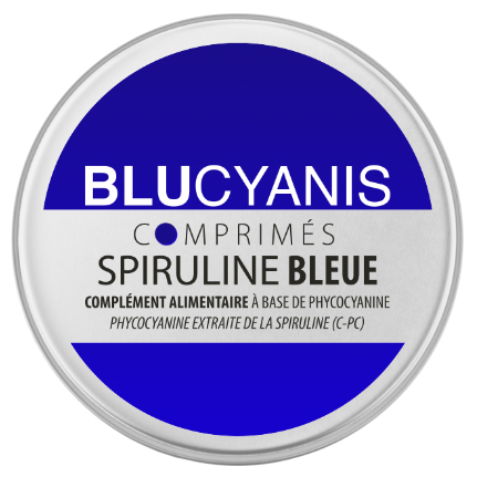 Premiers comprimés de phycocyanine. Pigment bleu, extrait de la spiruline (c-phycocyanine). Une très haute concentration d'actifs dans un volume incroyablement compact.